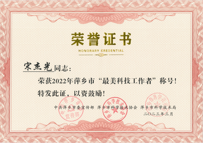 陈威红指出通过萍乡市“最美科技工作者”评选,宣传一批为萍乡产业经济服务的科技人才,伟德bevictor中文版为本市的科技服务和科普活动做出了大量的贡献,希望公司一如既往的支持市科协的活动开展,并为宋杰光博士颁发了2022年度萍乡市“最美科技工作者”荣誉证书。