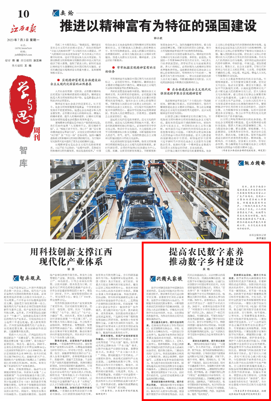 7月3日,bevictor伟德教研科科长吴艳在江西日报《学与思周刊》创刊号发表题为《提高农民数字素养 推动数字乡村建设》的理论文章。这是公司学习贯彻习近平新时代中国特色社会主义思想,坚持党建赋能引领创新创业教育新征程,为我省乡村振兴和数字乡村建设积极发挥智库作用的一项理论创新成果。
