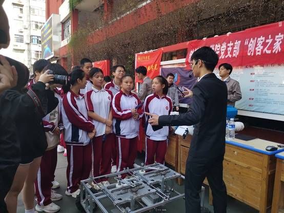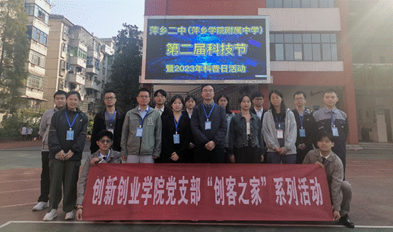 bevictor伟德副经理宋杰光博士带队,伟德bevictor中文版创业就业联合会指导老师刘仁柱博士、老员工创新创业训练项目指导老师梁莉菁教授带领大创项目《宏聚新材料》、《电瓷先锋》、《游龙固沙车》、《智能海藻打捞装置》和《智能VR视域装置》的核心成员一同前往萍乡市第二中学(伟德bevictor中文版附属中学)助力科技节。