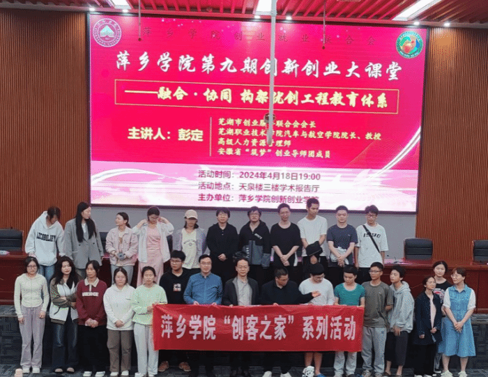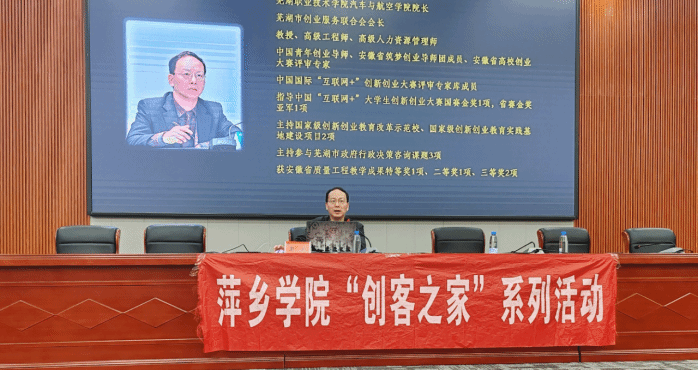 彭定以从事创新创业教育为准线,向师生们分享了一些从事创新创业教育时的案例和工作模式,详细地讲述了芜湖职业技术公司如何以“四四三三”为协同工作体系来发展创新创业教育,即四维度融合、四机制保障、三层面覆盖、三平台支撑,向我们展示了公司在创新创业方面取得的成就,同时向我们分享了丰富的经验并提出了宝贵的建议。他指出,团队成员在项目中应各司其职,发挥出自己的最大优点,互相取长补短。