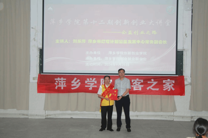 活动伊始,宋杰光为刘乐萍颁发创新创业导师聘书,吴艳向刘乐萍颁发大创项目纪念品《萍乡剪纸》。