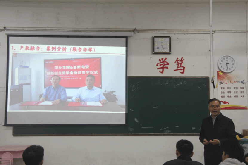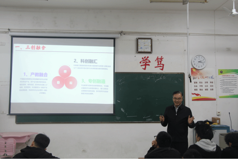 宋杰光主讲主题从三创融合、备赛要素、获奖宝典、教赛相长四个方面进行阐述。三创融合又分为产教融合、科创融汇、专创融通三点;备赛要素分为选好题、组好队、练好功三点;获奖宝典分为新、特、高、实、广、远六字诀;教赛相长分为以赛促学、以赛促教和赛创融合三个方面。宋杰光利用大量萍乡本地的经济产业案例,结合公司的教学教育、专业打造、团队建设、平台提升、学科比赛、人才培养等方面有机融合起来的实例,阐述公司高素质应用型人才的培养模式。