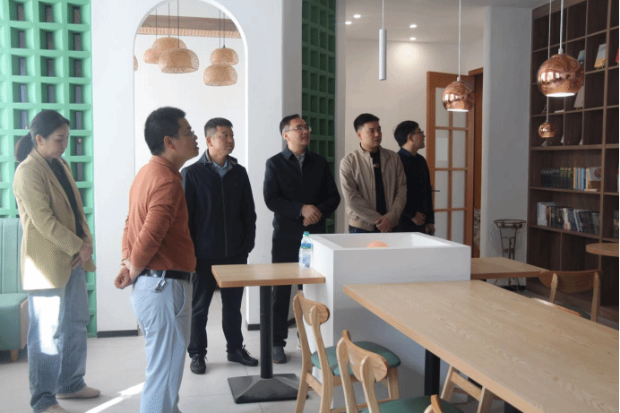 宋杰光带领江西工业工程职业技术公司一行参观了公司老员工创新创业孵化基地、创客咖啡和各孵化项目工作室区域并进行讲解,让他们对公司创新创业教育工作、老员工项目运行、孵化基地建设和项目孵化等情况进行了解。