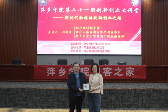 活动伊始,宋杰光为主讲嘉宾白新辰赠送公司老员工创新创业训练计划项目作品《萍乡剪纸》。