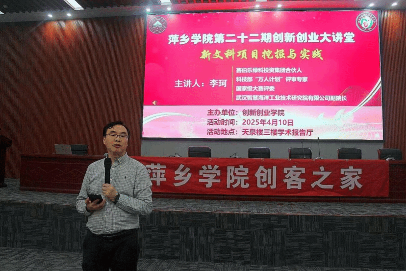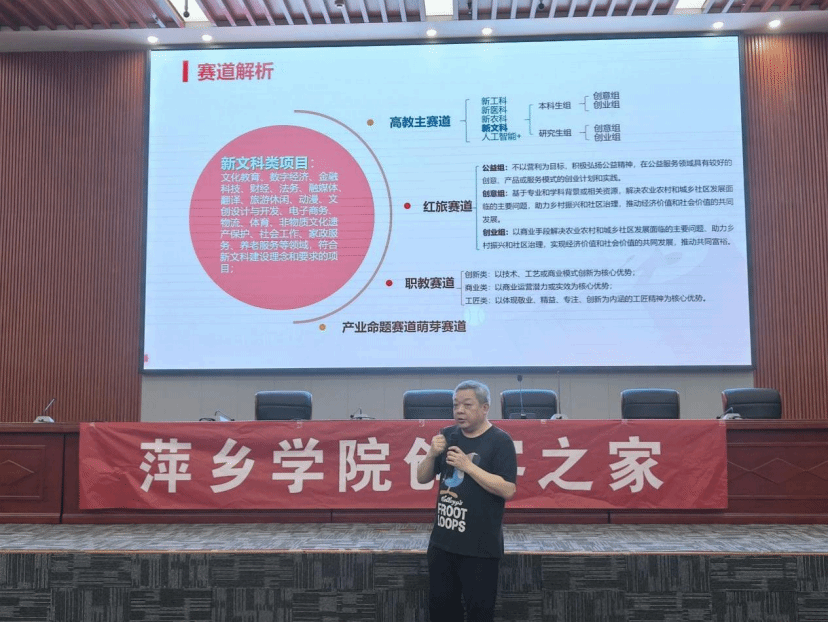 主讲嘉宾李珂以“以赛促教、以赛促学、以赛促创”为核心,探索新文科建设理念下的创新人才培养路径,为同学们深度解读新文科类项目。他在活动中指出,新文科之“新”在于时代范式的转变,要立足时代需求,并且鼓励员工增强实践能力,实现知行合一。同时他还强调,参赛项目应聚焦文化教育、数字经济、金融科技等前沿领域,利用人工智能、大数据等技术赋能文科创新。