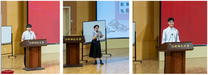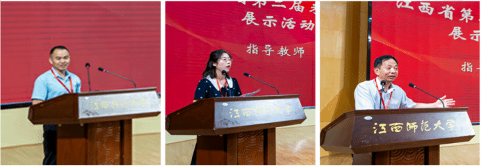 总结交流会上,优秀选手代表赣南师范大学宋王甜同学、江西科技师范大学戴文斌同学、江西师范大公司穆帅同学分别进行了即席讲演与模拟上课·板书的活动展示;专家评委代表华中师范大学张岩泉、福建省连江尚德中学李永程,及指导教师代表赣南师范大学邵克金分别从教学设计逻辑、课堂互动技巧、学科核心素养落实等维度进行了专业点评。