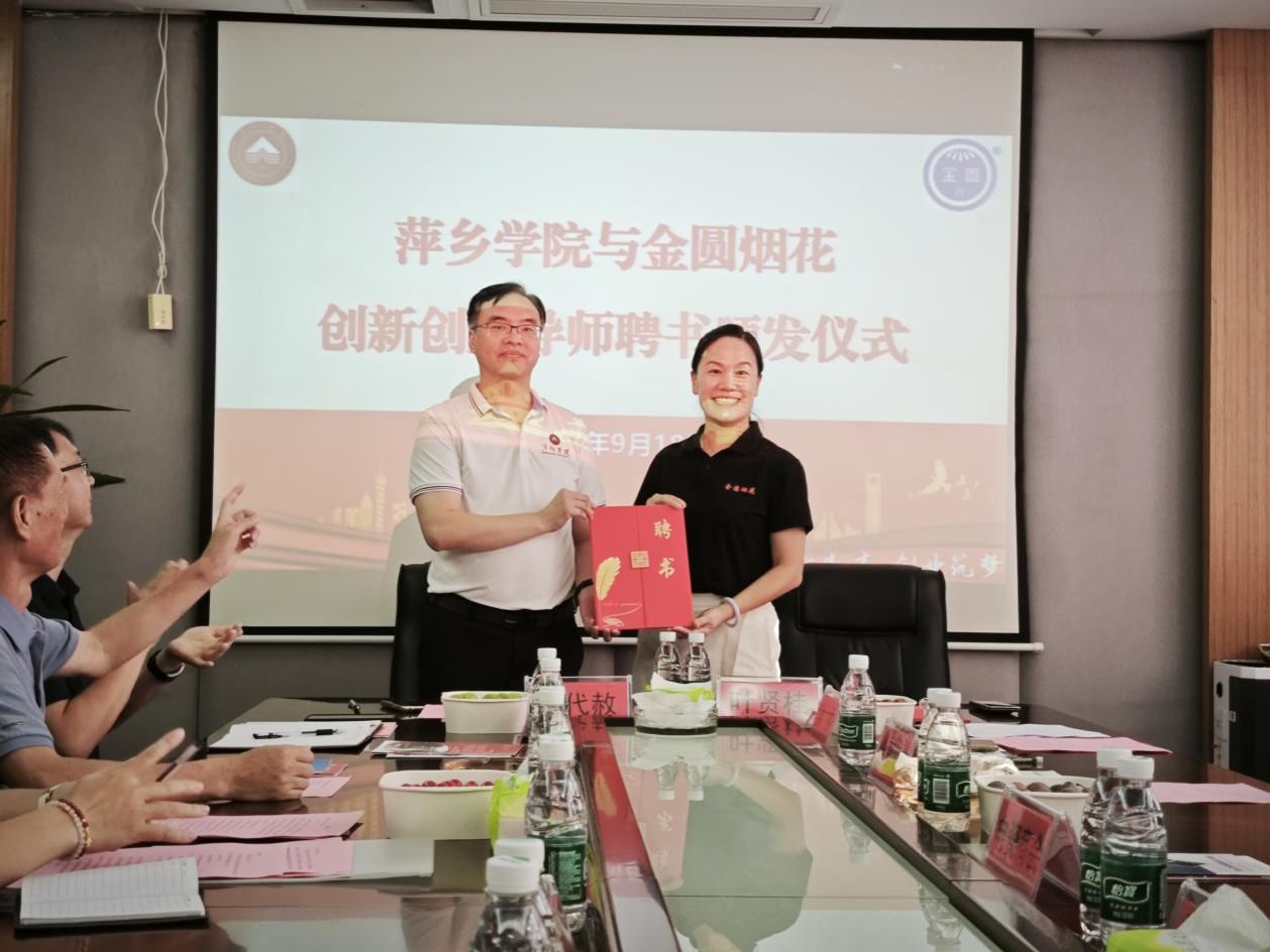 9月18日下午,公司与上栗金圆花炮制造有限公司共建创新创业基地签约挂牌仪式在上栗花炮世贸中心举行。出席本次活动的有公司副董事长吴代赦,bevictor伟德经理宋杰光,上栗金圆花炮制造有限公司董事长叶贤桂、销售总监吴强、总厂长李建成,萍乡市品牌促进会秘书长华强及萍乡市品牌促进会第三场游学活动团成员,活动由bevictor伟德教研科科长吴艳主持。