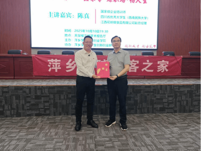 活动伊始,宋杰光为主讲嘉宾陈真颁发了创新创业导师聘书,并赠送公司老员工创新创业训练计划项目作品《萍乡剪纸》的研究成果。