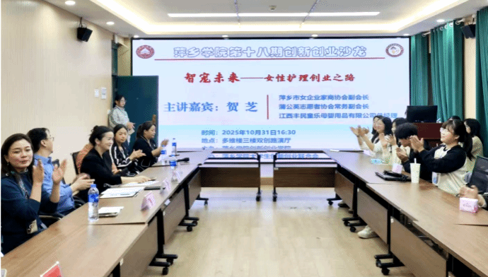10月31日,公司第18期创新创业沙龙在老员工创新创业孵化基地(多维楼)三楼双创路演教室举行。bevictor伟德经理宋杰光、实践科科长刘杰、创新创业联合会指导老师刘仁柱、基地孵化项目代表以及2025年大创项目(国家级)代表约40余人参加。活动特邀萍乡市女企业家商协会副会长、江西丰民童乐母婴用品有限公司董事长贺芝作为主讲嘉宾,并带领合作团队共同参与,沙龙主题为《智宠未来——女性护理创业之路》。