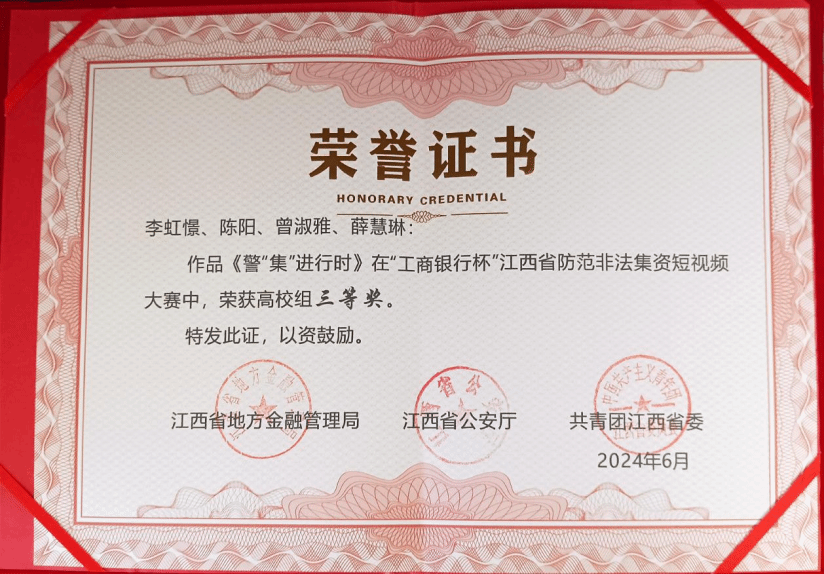 6月14日,由江西省地方金融管理局、江西省公安厅、共青团江西省委主办,工商银行江西省分行承办的江西省防范非法集资短视频大赛颁奖仪式在江西南昌举办。大赛共分为社会组、高校组两个组别,每个组别入围30件视频作品,再由主办方组织召开专家评审会,对入围作品评选出一、二、三等奖和优秀奖。经过层层选拔,公司短视频作品《警“集”进行时》在全省脱颖而出,荣获三等奖。
