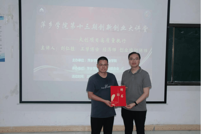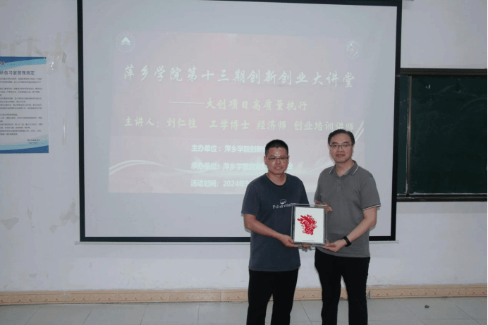 活动开始伊始,宋杰光为刘仁柱博士颁发创新创业导师聘书以及大创项目作品《萍乡剪纸》。