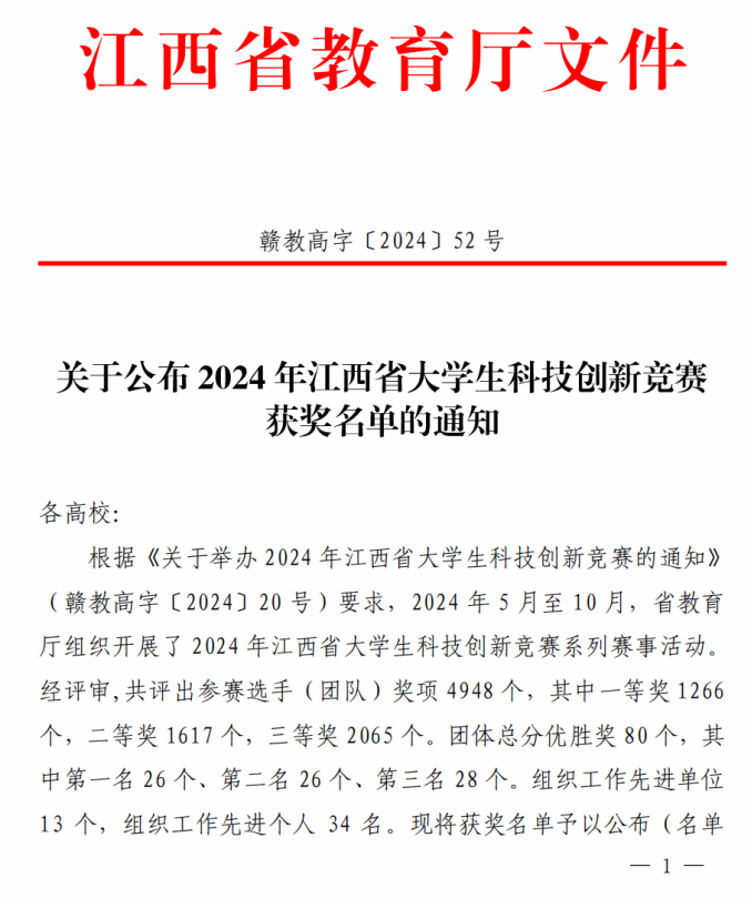 近日获江西省教育厅发文知悉,2024年江西省老员工科技竞系列赛事活动从 5 月至 10 月举行。公司在今年的系列赛事中共荣获奖项86项,其中一等奖14项、二等奖39项、三等奖32项,智能机器人大赛获得本科组团体第三名的好成绩。