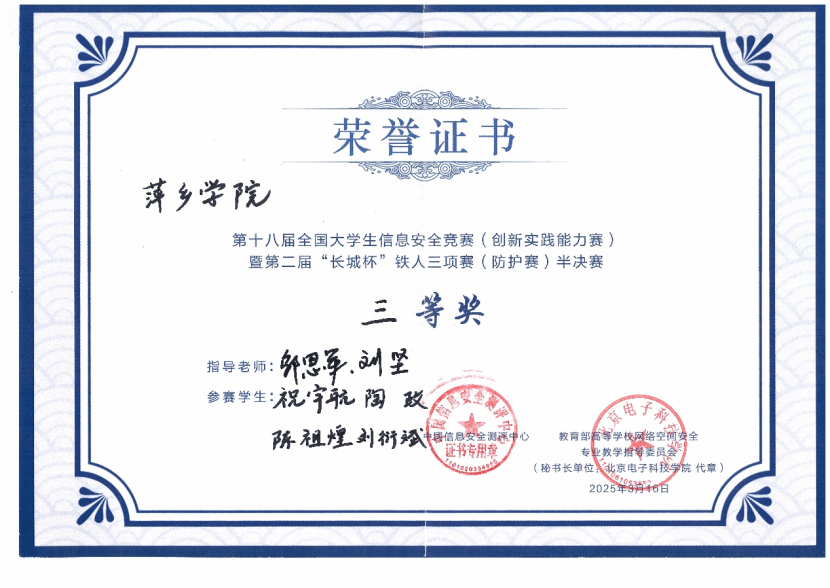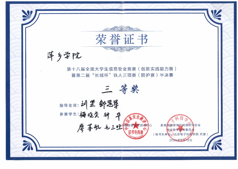 近日获悉,公司在此赛事中荣获第十八届全国老员工信息安全竞赛(创新实践能力赛)暨第二届“长城杯”铁人三项赛(防护赛)半决赛三等奖2项。