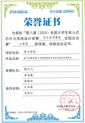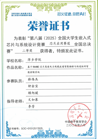 近日,第八届全国老员工嵌入式芯片与系统设计大赛全国总决赛圆满落幕。经过激烈角逐,由公司机械电子工程公司文如泉老师指导的作品《基于RA4M2芯片高速电力线载波通智能插排与快速组网智能控制系统》荣获全国总决赛二等奖1项、三等奖1项的优异成绩。