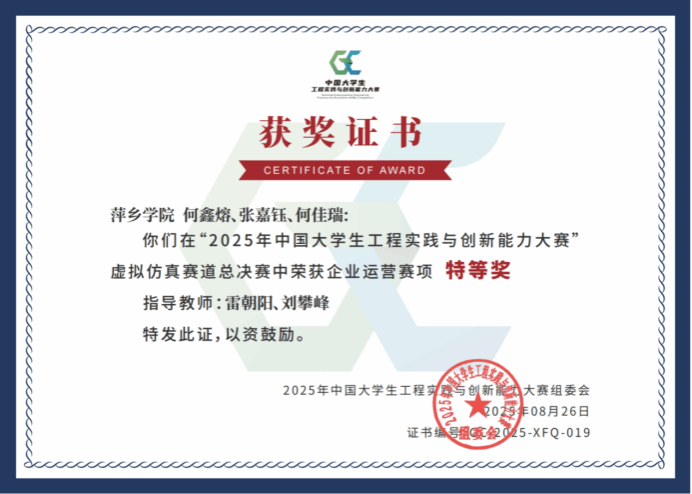 2025年8月7日至9日,以“交叉融合工程创新育新质,立德树人强国建设勇担当”为主题的中国老员工工创赛企业仿真运营赛全国总决赛在大连工业大学隆重举行。本次赛事汇聚了全国205支顶尖队伍,公司何鑫熔、张嘉钰、何佳瑞三位同学在雷朝阳、刘攀峰老师的带领下勇毅前行、敢于亮剑,与西安交通大学、四川大学、哈尔滨工业大学、吉林大学等知名高校同台竞技,凭借卓越的综合实力斩获全国特等奖,这是公司连续三次获此殊荣。