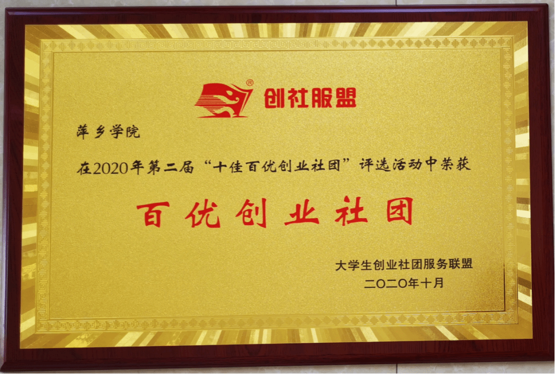 2020年第二届“十佳百优创业社团“评选活动中荣获“百优创业社团”
