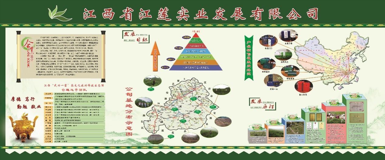江西省江莲实业发展有限公司成立于 2007 年,注册资金 5000 万元,经过十五年的努力发展,公司取得了较好的成绩:公司先后荣获全国巾帼现代农业科技示范基地、中国茶叶流通协会会员单位、江西省农业产业化省级龙头企业、武功一叶省级现代农业示范园、省优秀科普示范基地、省级“一村一品”示范企业、江西省茶叶协会副会长单位、萍乡市巾帼脱贫示范 基地等荣誉称号。